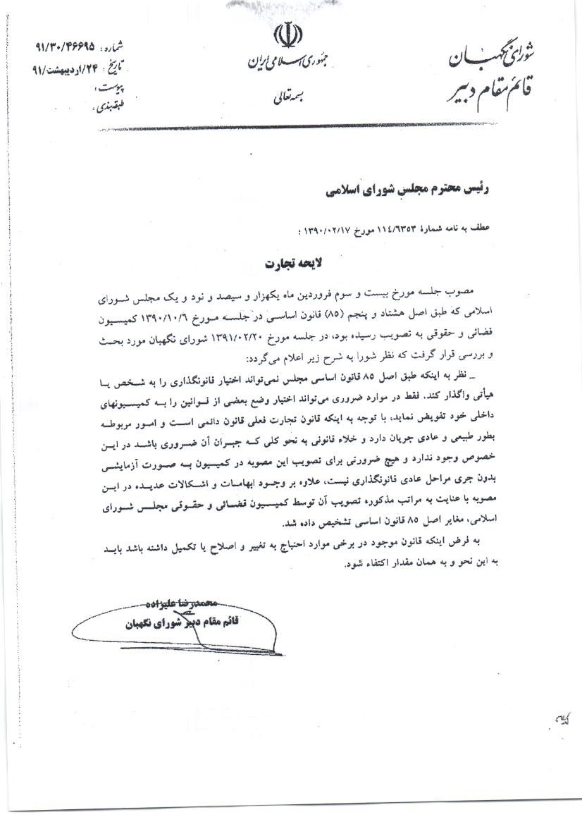 درخواست وزیر صنعت و رییس اتاق بازرگانی ایران مبنی بر استرداد لایحه تجارت از مجلس شورای اسلامی