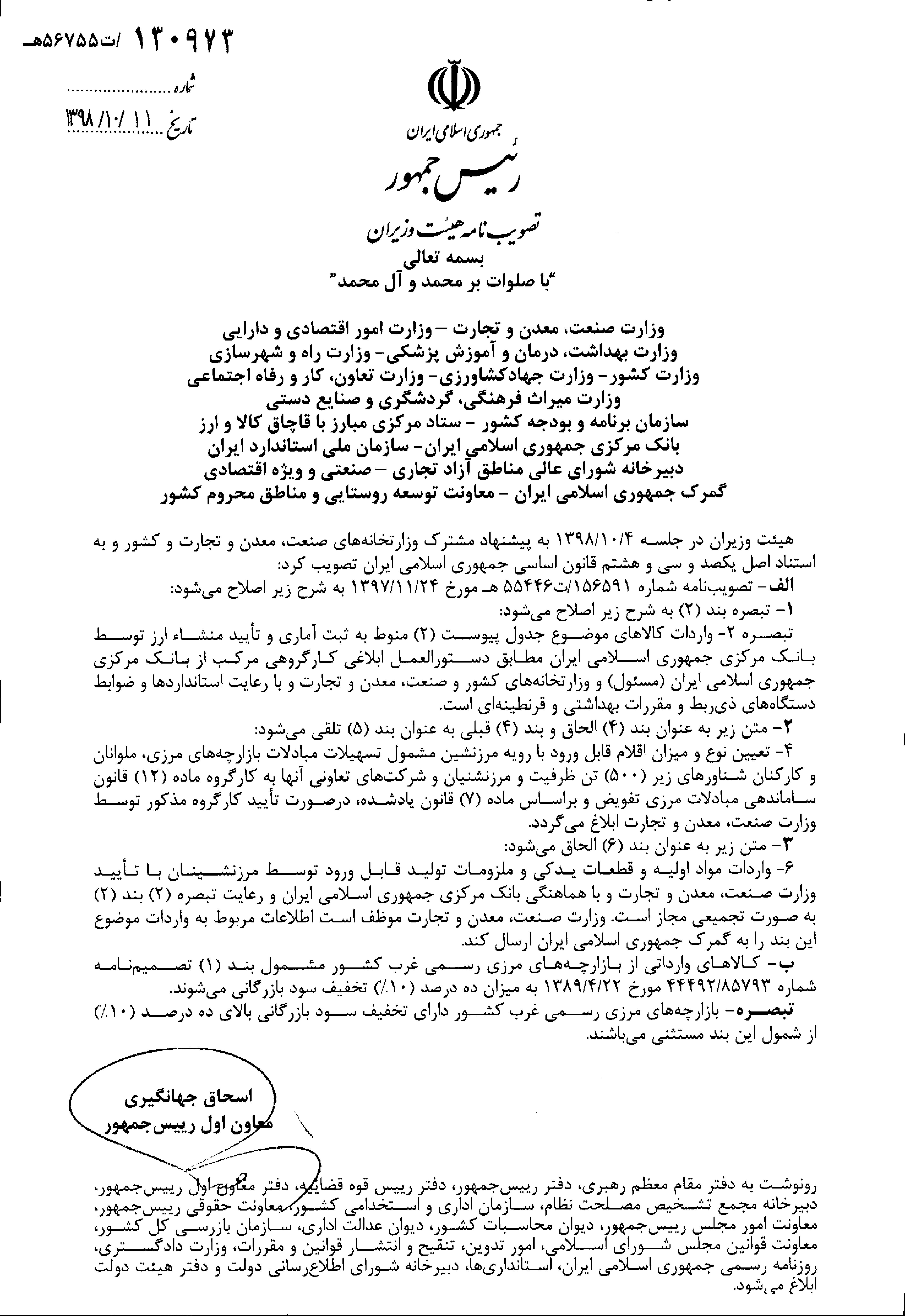 تصویب نامه هیئت نامه وزیران از آقای دشتیان کمیسیون مبارزه با قاچاق کالا و ارز استان.