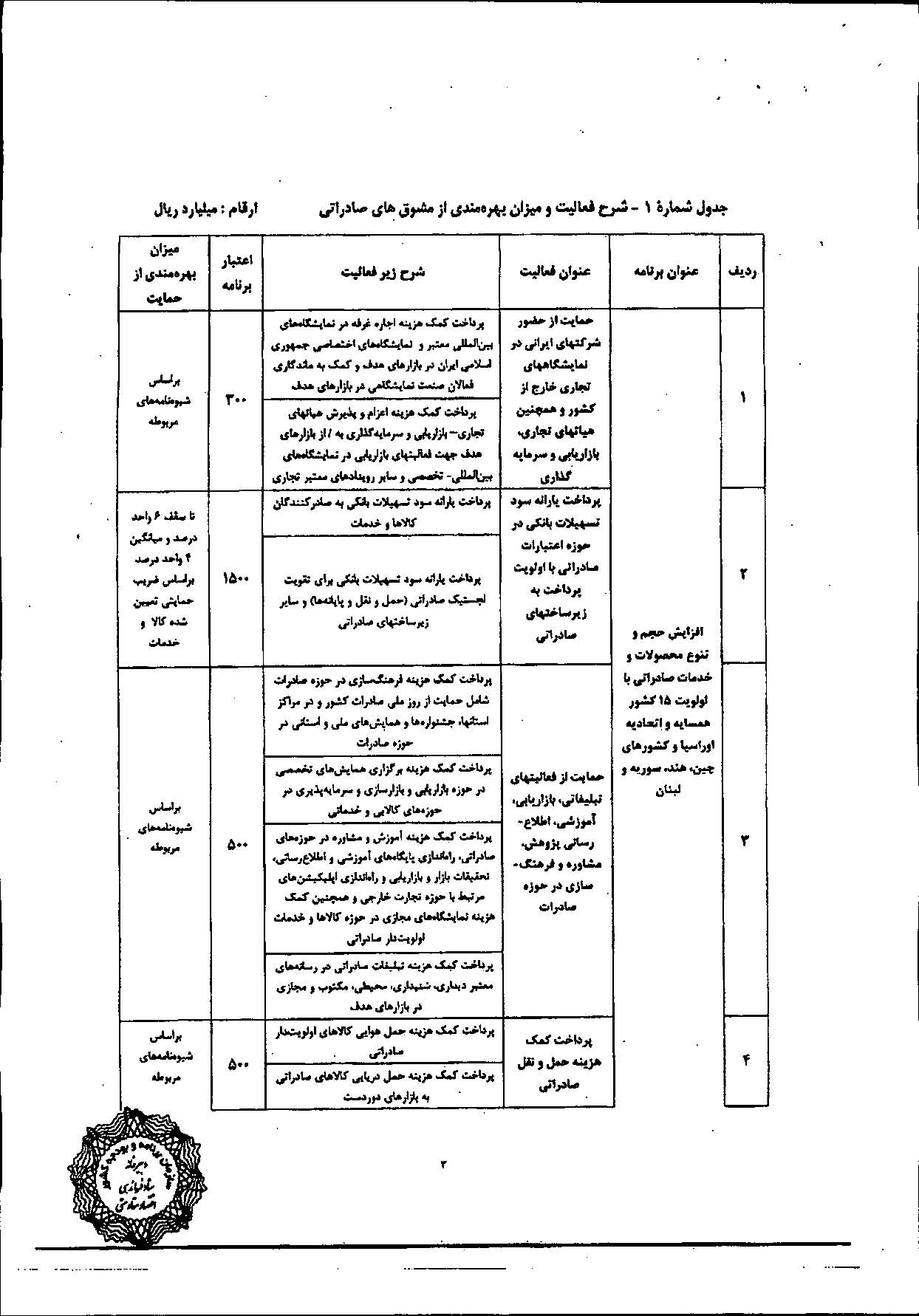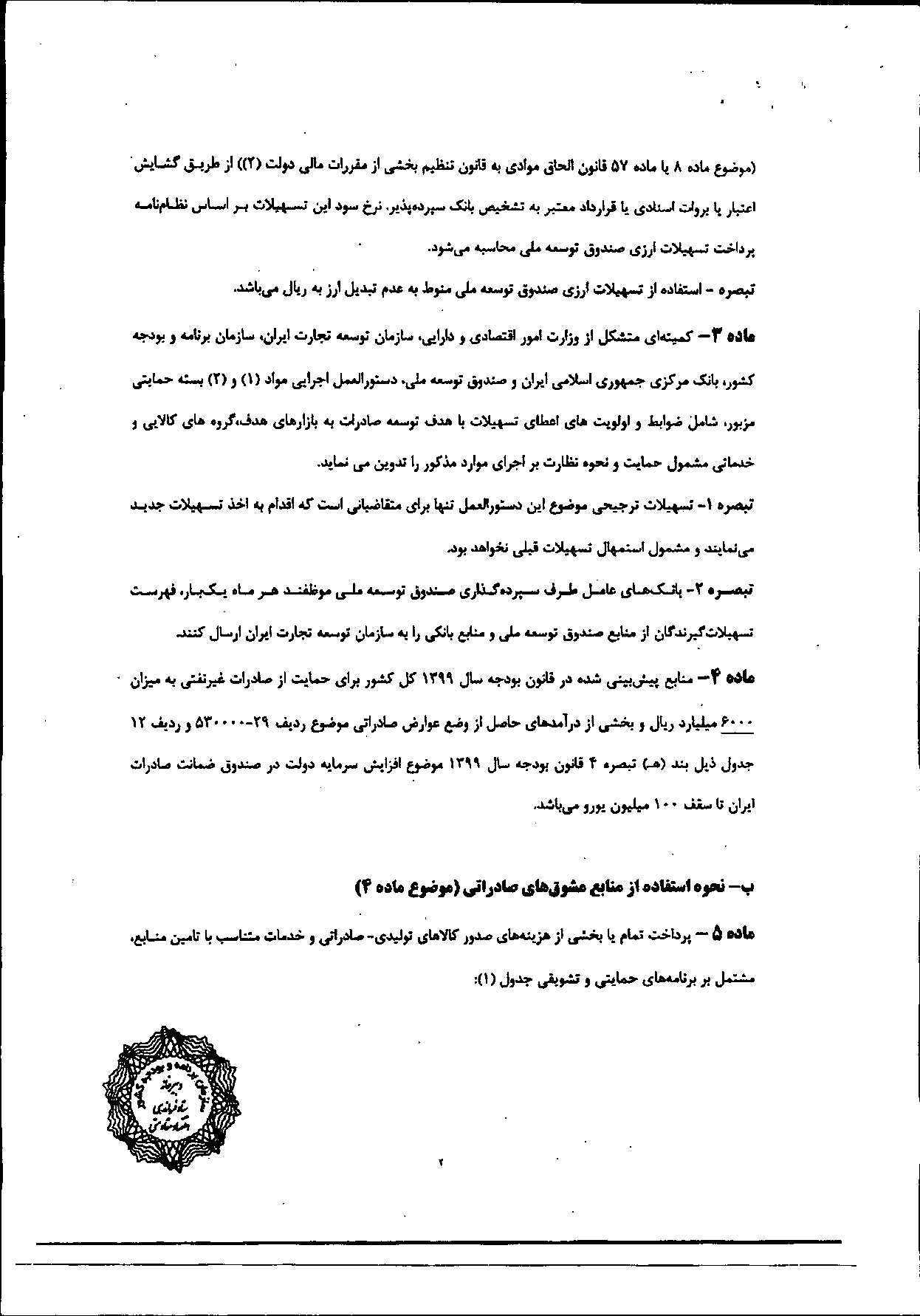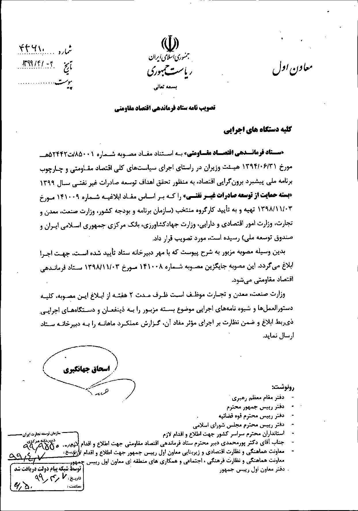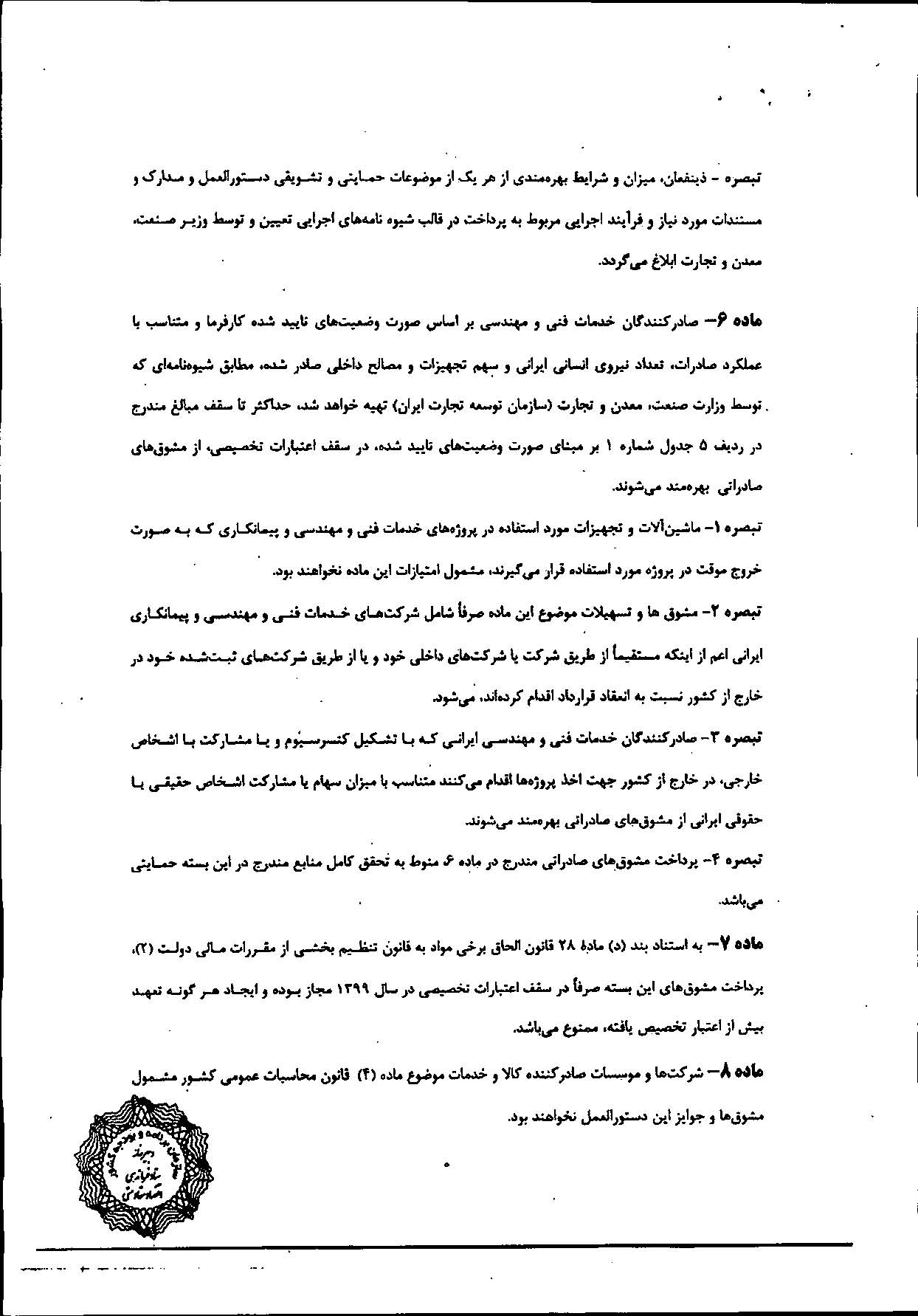 پرداخت مشوق‌های صادراتی مندرج در بند ۵ بسته حمایت از صادرات غیر نفتی سال ۱۳۹۹ که توسط معاون اول محترم رئیس جمهور و رئیس ستاد فرماندهی اقتصاد مقاومتی ابلاغ گردیده است