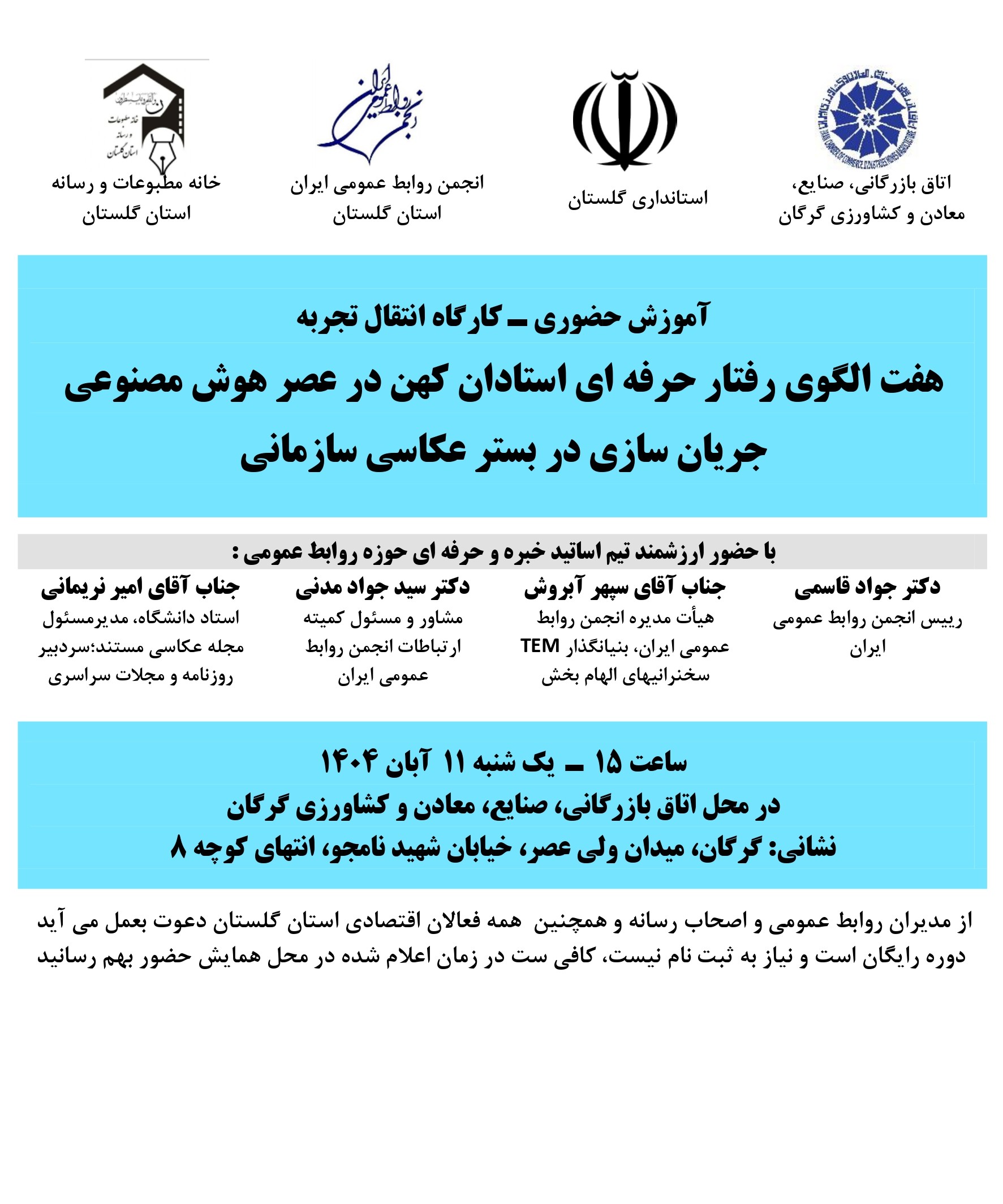 آموزش هفت الگوی رفتار حرفه ای استادان کهن در عصر هوش مصنوعی و جریان سازی در بستر عکاسی سازمانی با حضور ارزشمند تیم اساتید خبره و حرفه ای حوزه روابط عمومی : دکتر جواد قاسمی رئیس انجمن روابط عمومی ایرا...