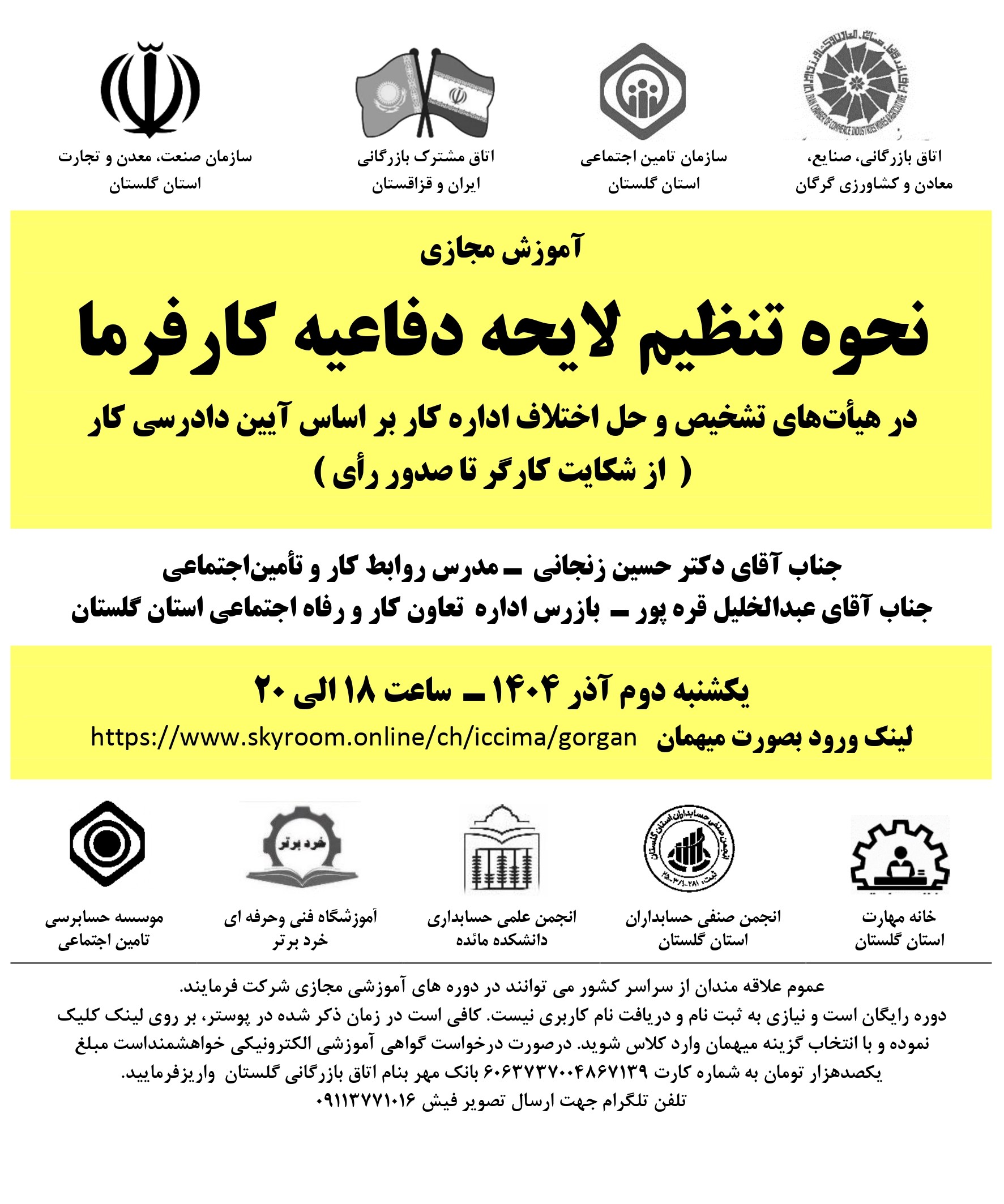 آموزش نحوه تنظیم لایحه دفاعیه کارفرما در هیأتهای تشخیص و حل اختلاف اداره کار (از شکایت کارگر تا صدور رأی ) با تدریس دکتر حسین زنجانی و جناب آقای عبدالخلیل قره پور و باهمکاری خانه مهارت گلستان و با...