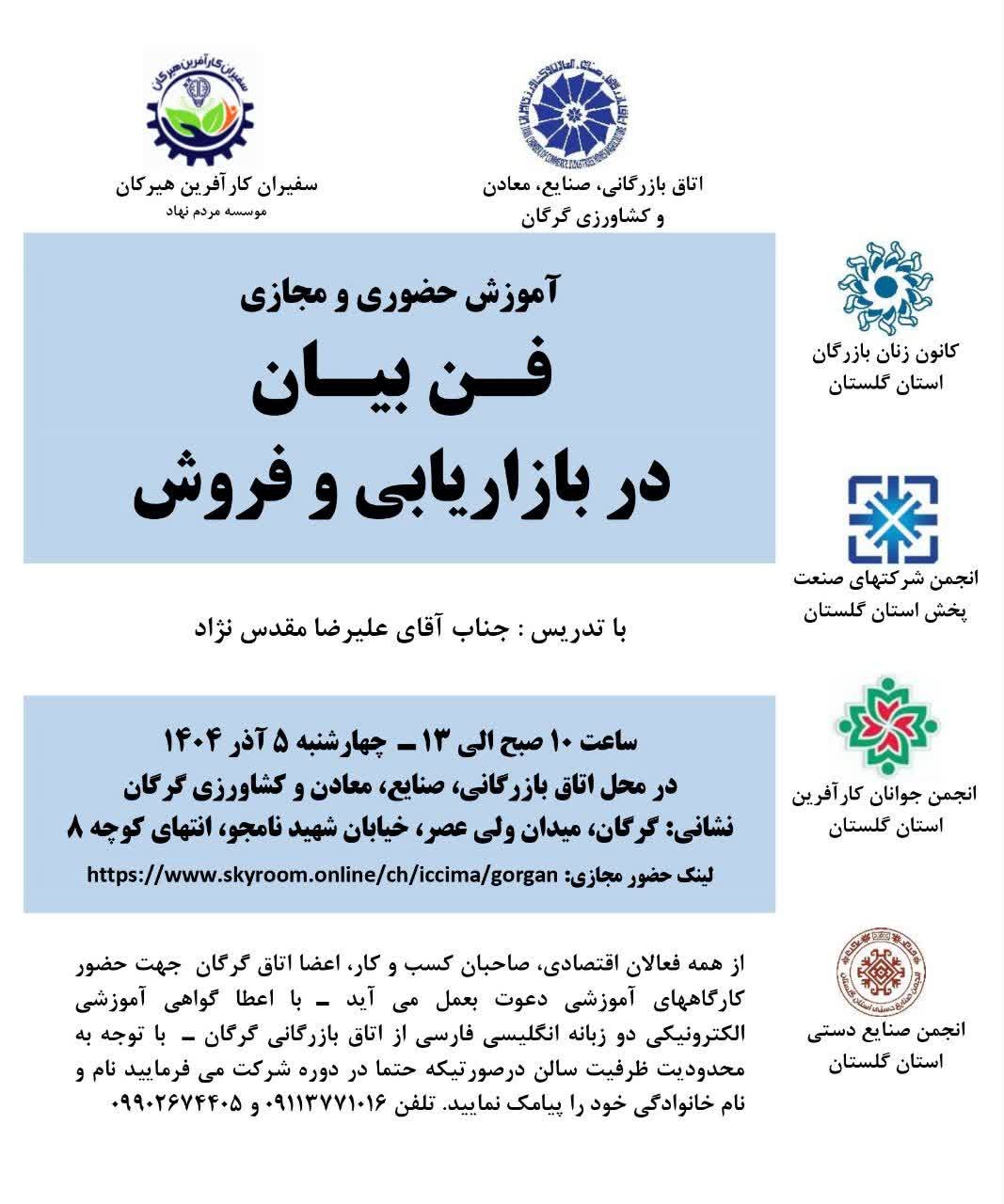 آموزش فن بیان در بازاریابی و فروش با تدریس جناب آقای علیرضا مقدس نژاد و با همکاری و مشارکت موسسه سفیران کارآفرین هیرکان و با حضور ۱۸۰ نفر در ۵ آذر ۱۴۰۴ در اتاق گرگان برگزار گردید. @emcgolestan #...