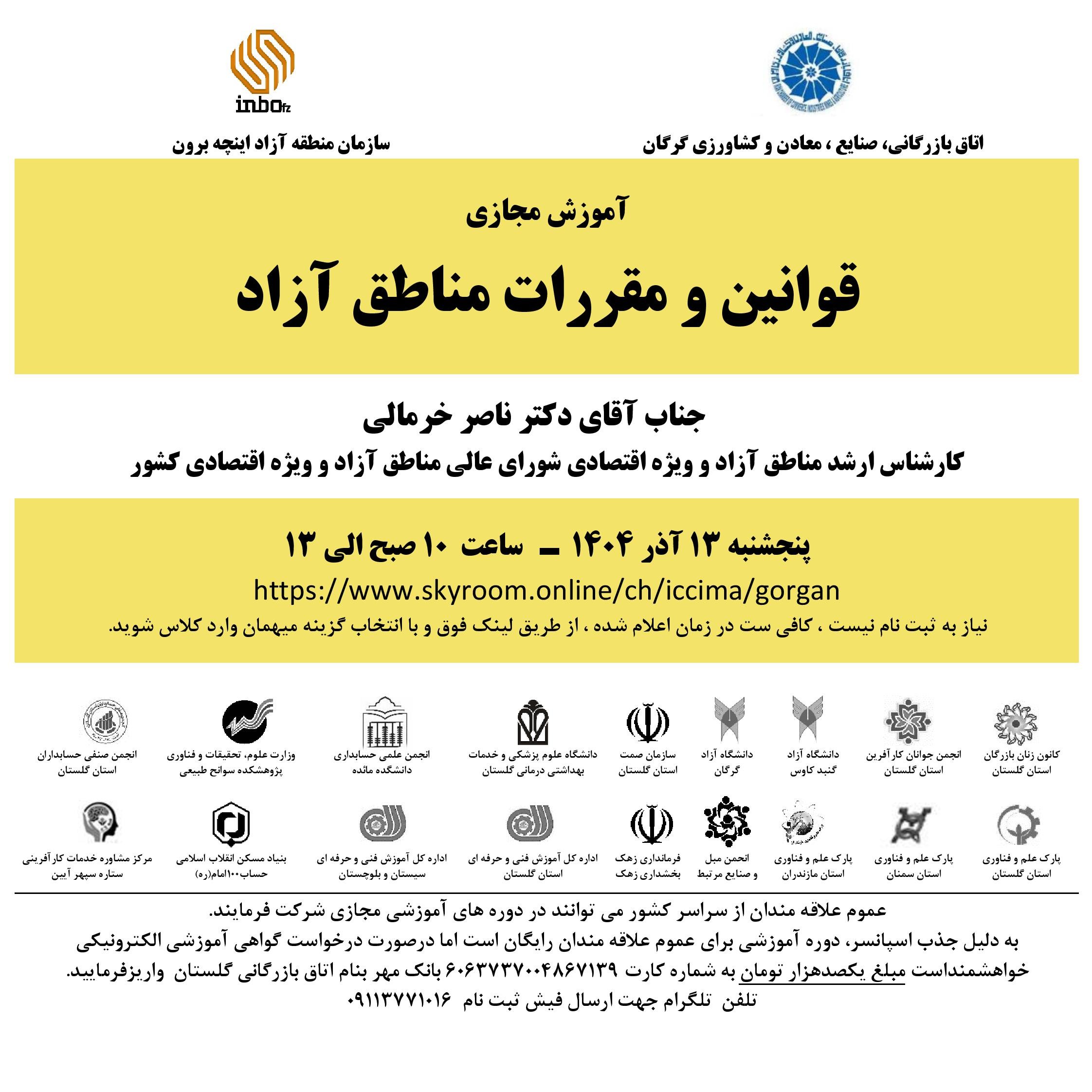 آموزش قوانين و مقررات مناطق آزاد با تدریس جناب آقای دکتر ناصر خرمالی، کارشناس ارشد مناطق آزاد و ویژه اقتصادی شورای عالی مناطق آزاد و ویژه اقتصادی کشور با همکاری مشترک اتاق گرگان و سازمان منطقه آزاد ا...