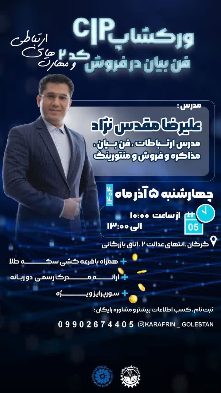 آموزش رایگان فن بیان در فروش 10صبح 5 آذر 1404 در محل اتاق بازرگانی، صنایع، معادن و کشاورزی گرگان نشانی: گرگان، میدان ولی عصر، خیابان شهید نامجو، انتهای کوچه هشتم