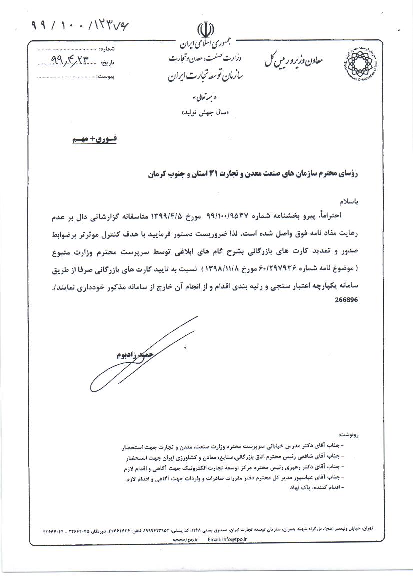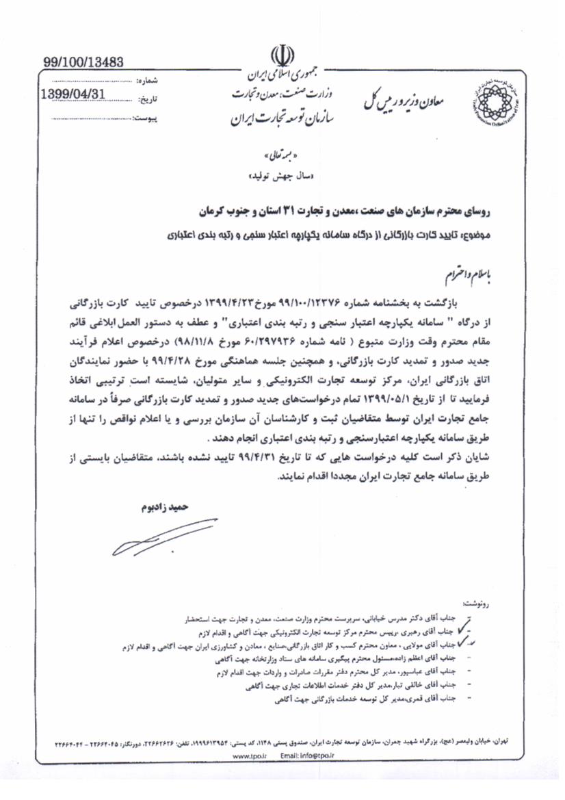 تایید کارت های بازرگانی سازمان صمت از طریق سامانه یکپارچه اعتبار سنجی و رتبه بندی اعتباری
